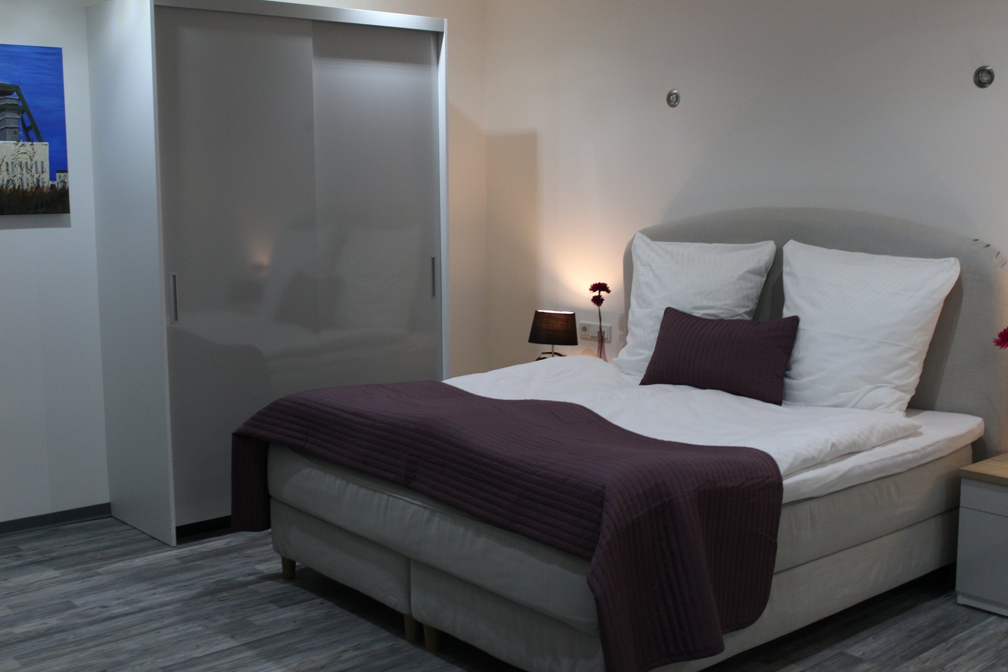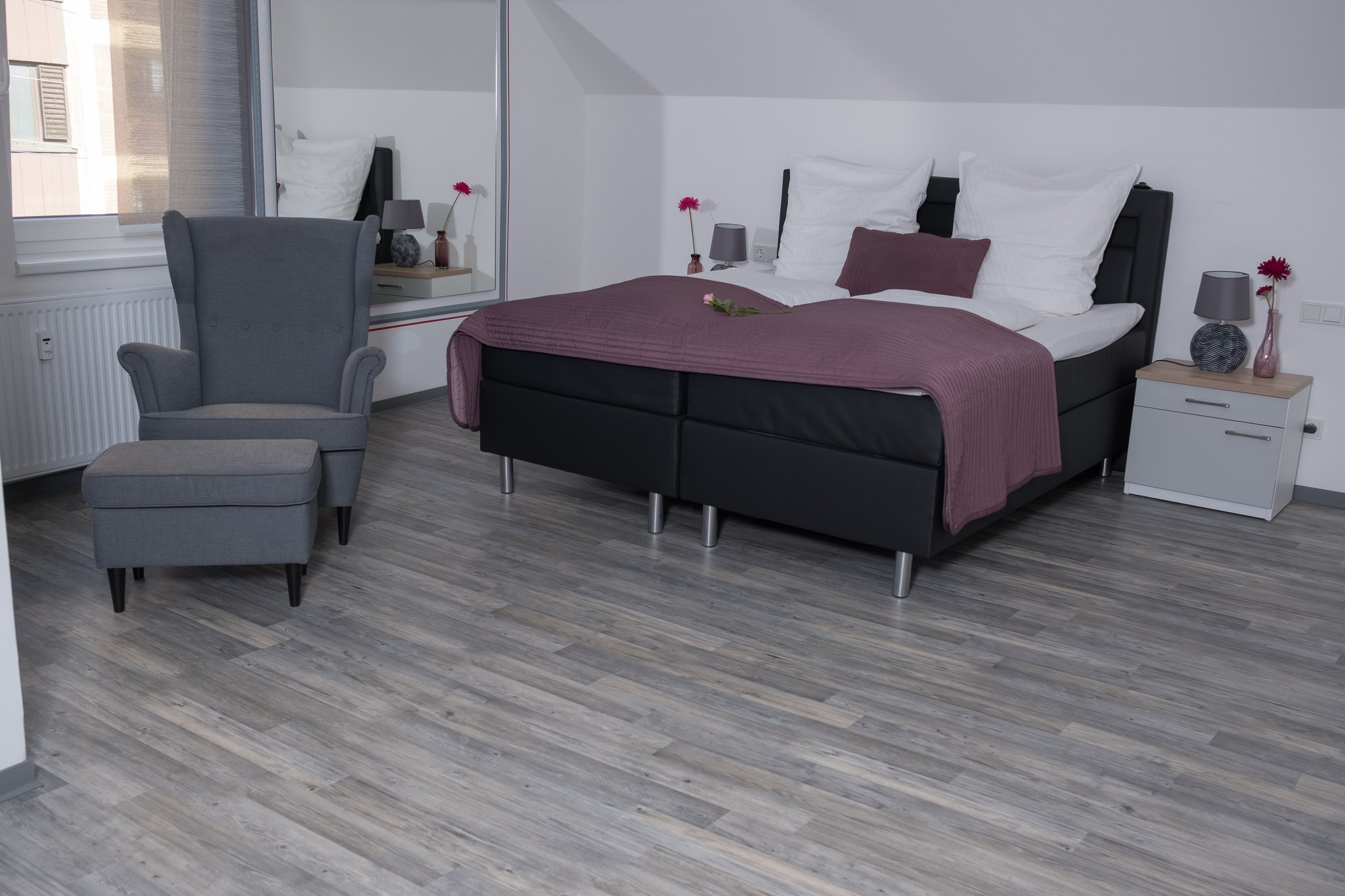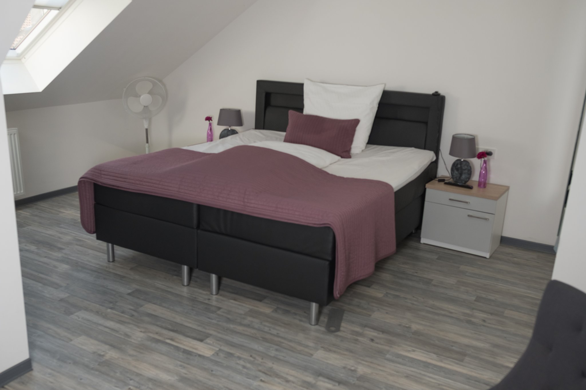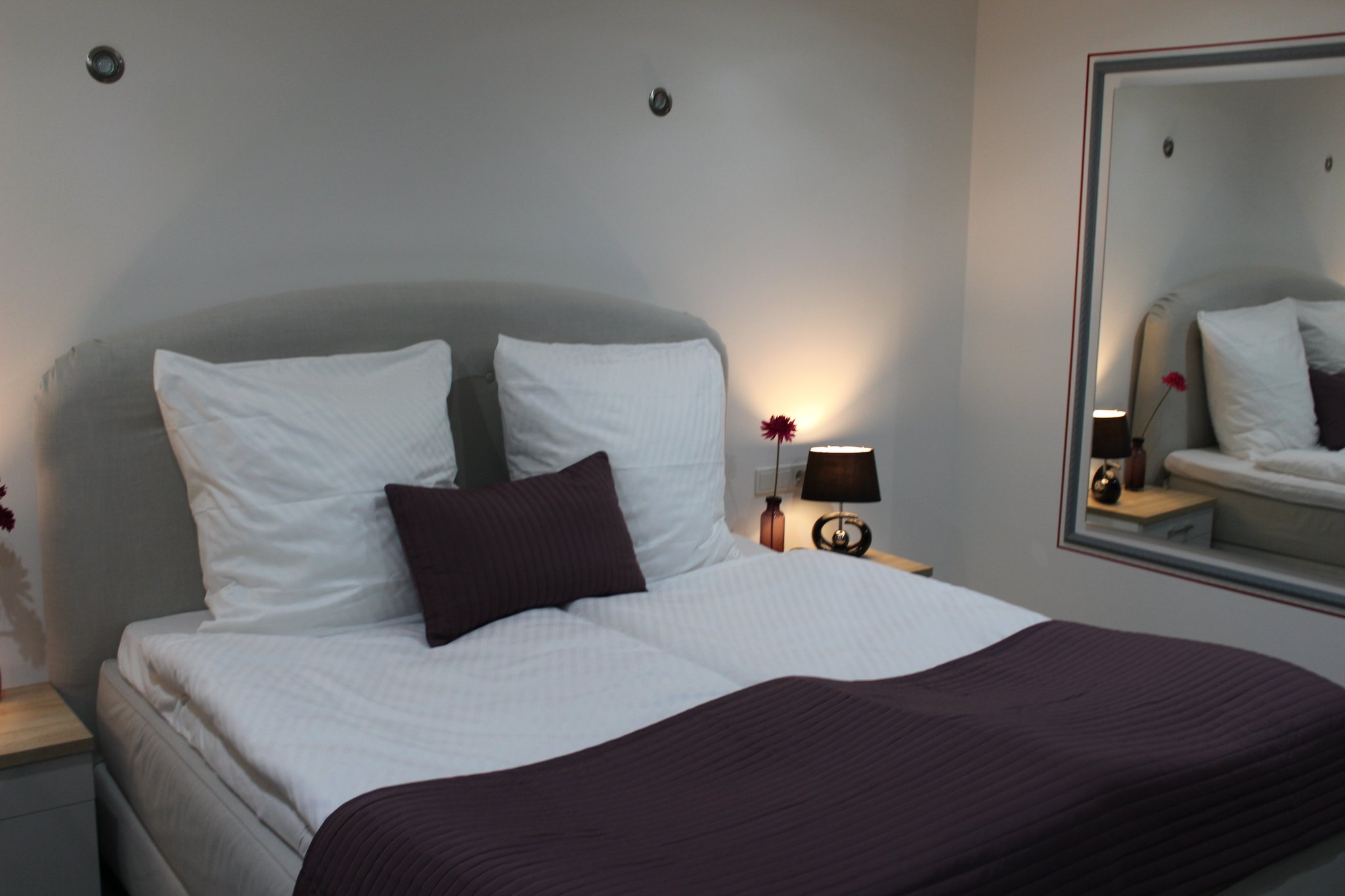 Alle unsere Zimmer sind mit einem 160 bzw. 180 cm × 200 cm großen Boxspringbett ausgestattet. Das Mobiliar lädt unsere Gäste zum Verweilen und Entspannen ein, sei es nach einem langen Ausflugstag oder nach einem anstrengenden Arbeitstag.