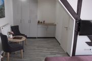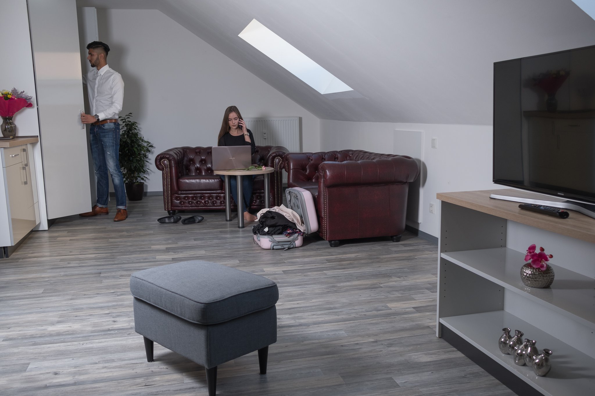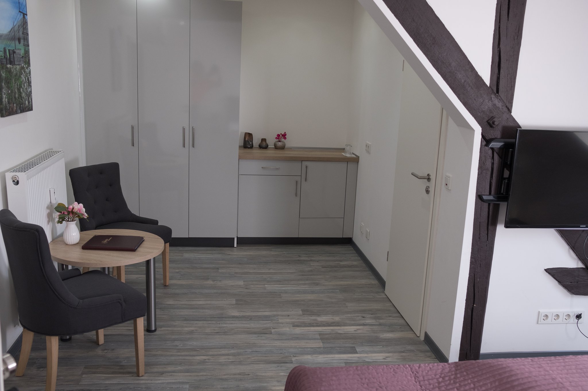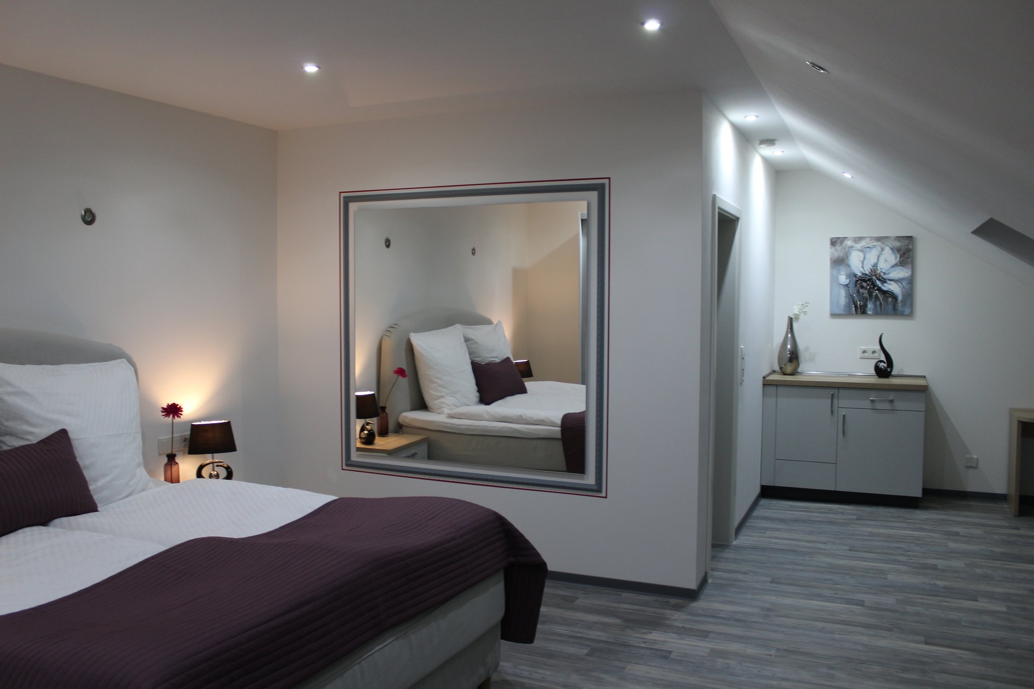 Alle unsere Zimmer sind mit einem 160 bzw. 180 cm × 200 cm großen Boxspringbett ausgestattet. Das Mobiliar lädt unsere Gäste zum Verweilen und Entspannen ein, sei es nach einem langen Ausflugstag oder nach einem anstrengenden Arbeitstag.